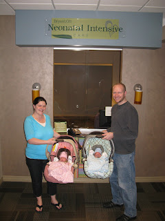 Kevin getting them all strapped in for the ride home. They both passed their "car seat" tests the day before. The NICU staff put the babies in their car seats and monitored their vitals for about 90 minutes, just to make sure that the sitting position didn't put stress on their heart or lungs.